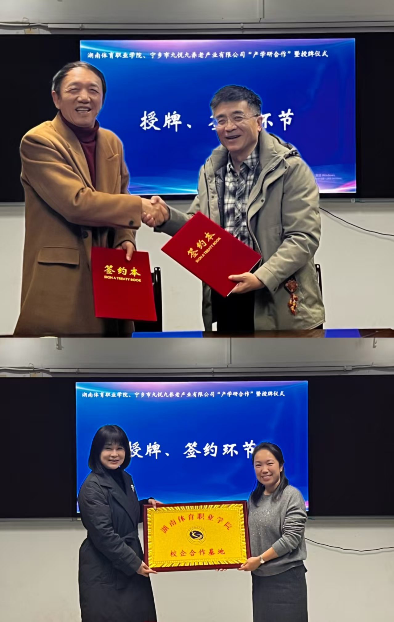 本网讯(通讯员:刘志武 周梦佳)12 月 23 日,岁末启新,暖意融融。湖南体育职业学院与宁乡市九悦九养老产业有限公司校企合作签约仪式圆满举行。湖南体育职业学院党委副书记、副校长彭庆文,科技与社会服务处处长冯晴、副处长罗莹、体育健身与健康促进学院院长王一蓉、书记魏华祝、副院长刘志武、副书记祝彩和九悦九养老产业有限公司董事长周用清、副董事长周立中、总经理冯海容等出席仪式并发表讲话,双方代表齐聚一堂,共商合作大计,共绘发展蓝图。